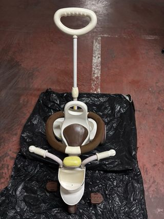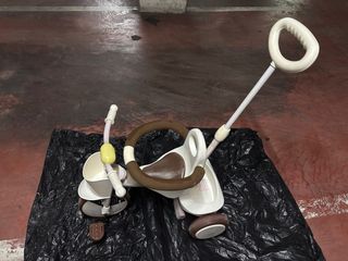 Triciclo iimo en color blanco y marrón. - Diseño moderno y funcional. - Rueda delantera giratoria. - Barra de empuje para padres. - Reposapiés plegable.