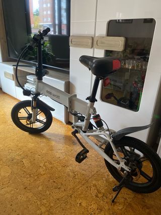 Bicicleta eléctrica plegable, casi nueva, con muy poco uso ya que se compró en 2019 y solo se usó durante un año. Lleva sin usarse hasta ahora. Lo único que cabe destacar es que la BATERÍA dura muy poco por lo que habría que CAMBIARLA (según lo dicho en el taller). El precio original es de 335.