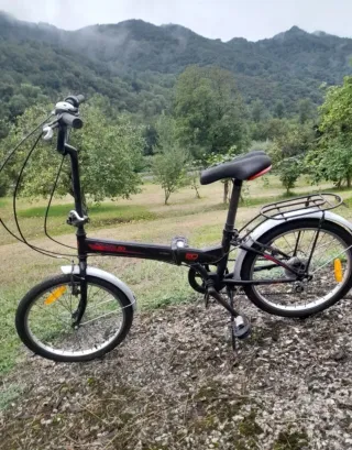 Bicicleta plegable de color negro con detalles en rojo, ideal para transportarla y guardarla fácilmente. - Cuadro plegable. - Llantas en buen estado - Muy manejable - Portabultos trasero.