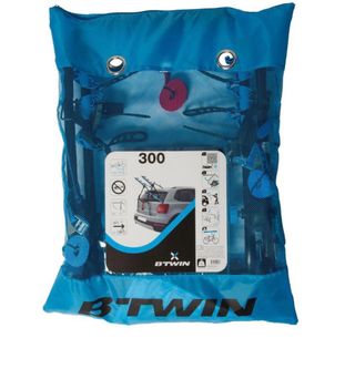 Portabicicletas de la marca Btwin, modelo 300. Es plegable para facilitar su almacenamiento y transporte. - Se adapta a la mayoría de vehículos. - Capacidad para 2 bicicletas. - Incluye bolsa de transporte. - Buen estado.