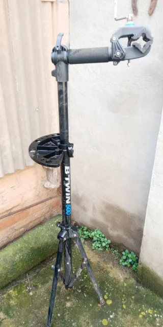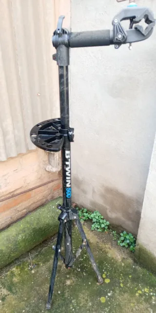 Soporte de reparación Btwin 500 para bicicletas. Ideal para mantenimiento y ajustes. - Estructura robusta de metal. - Pinza ajustable para el cuadro. - Bandeja portaherramientas. - Plegable para fácil almacenamiento.