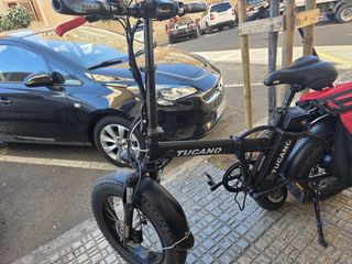 Bicicleta eléctrica Tucano de estilo plegable, ideal para desplazamientos urbanos. - Marco de color negro. - Ruedas anchas tipo fat bike. - Sillín negro. - Portaequipajes trasero. -440 km solamente. - Muy muy poco usada. -Bastante bien conservada.