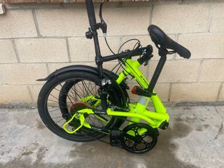 Bicicleta plegable de color verde lima, ideal para desplazamientos urbanos y fácil de guardar. - Cuadro de aluminio ligero. - Ruedas de 20 pulgadas. - Guardabarros delantero y trasero. - Reflectores en ruedas y pedales.