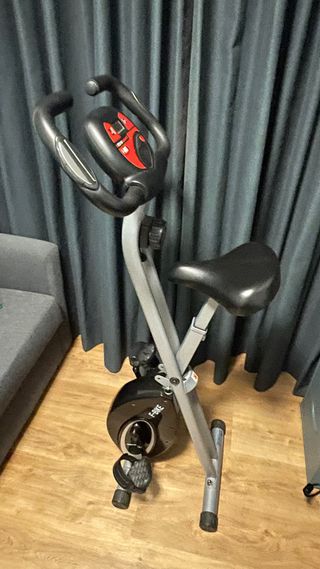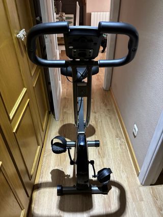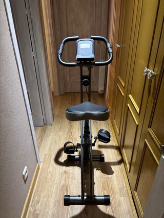 Bicicleta estática de diseño plegable, ideal para ejercitarse en casa. - Asiento acolchado. - Manillar ergonómico. - Pedales con agarre. - Estructura robusta. - Medidas abierta: 90cms ancho aprox. y cerrada 50 cms, altura 1.33 cms, pesa 16k. - No funciona el marcador digital. - Desperfectos estéticos en esponja cobertura de agarre - Tiene regulador de sillín 3 alturas - Regulador de intensidad muy bueno. - Regulador de ajuste de pedales - Regalo Esterillas de suelo antideslizantes y amortiguadoras, 2 de 64x64cms