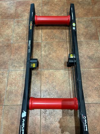 Rodillo de entrenamiento para bicicleta, de Rulos - Estructura plegable de color negro. - Rodillos de color rojo.