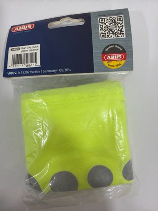 Funda impermeable original ABUS para casco de bicicleta, modelo Rain Cap Adult. • Color amarillo flúor, muy visible • Talla adulta universal • Protege el casco y la cabeza de la lluvia y el viento • Con elementos reflectantes para mayor seguridad • Ligera, plegable y fácil de llevar • Ideal para ciclismo urbano, carretera o commuting Producto nuevo, sin usar, en su embalaje original.