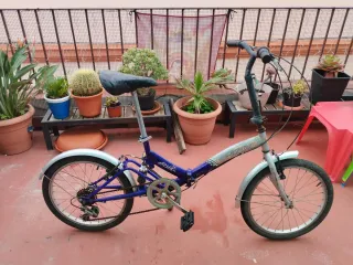 Bicicleta plegable de 20 pulgadas en un llamativo color azul. - Cuadro de bicicleta plegable. - Luz delantera y trasera( pilas) - Ruedas de 20 pulgadas. - portabultos trasero y delantera , se puede poner cesta Frenos v-aluminio , llantas luminio, cambios 6v , no los trae originalmente Venta en persona , no envío. Garantía de mecánica.
