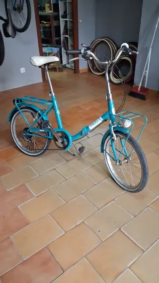 Bicicleta plegable de estilo antiguo, conservando sus componentes originales. Ideal para coleccionistas o para un uso urbano. - Color azul con detalles. - Sillín blanco con estampado. - Portabultos trasero.