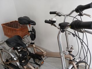Bicicleta plegable de color azul oscuro y plata. Tiene marchas, pata cabra, el sillín cambiado súper cómoda. Se pliega por la mitad, el manillar y los pedales. Cabe en un maletero. La compré de primera mano en Holanda hace diez años.