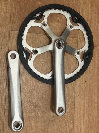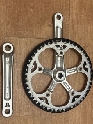 Juego de bielas para Brompton de 170mm y 50 dientes. Muy poco uso, mínimas marcas estéticas pero sin defecto ninguno. Incluyen tornillos de fijación aunque no aparecen en foto. Se pueden ver y probar sin compromiso. Se hacen envíos. Para más información contactar por mensaje. Bielas plato Bici plegable brompton - Color plateado. - Incluye plato y biela izquierda.