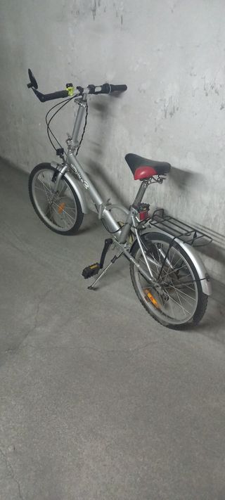 Bicicleta plegable de color plateado. - Cuadro de aluminio - Ruedas de 20 pulgadas. - Sillín ajustable. - Portabultos trasero. - Pata de cabra