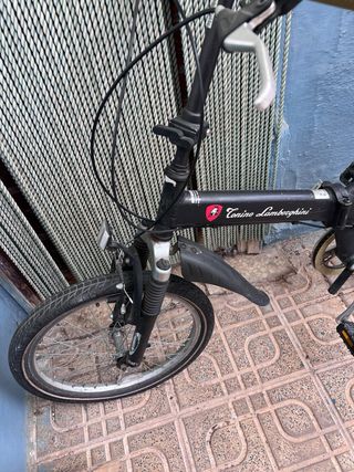 Bicicleta plegable de la marca Lamborghini, color negro. Tiene sus años, rueda trasera pinchada y algo de holgura en el pedal.