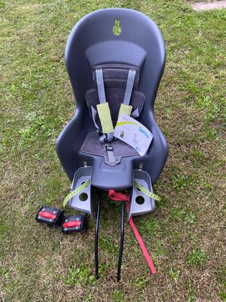 Sillita para bicicleta de color rojo y negro, con soporte de montaje. - Asiento acolchado. - Cinturones de seguridad. - Reposapiés ajustables. - Sillita reclinable. La sillita se puede reclinar hacía atrás por si el bebe se queda dormido. Sin apenas uso. Va incluida una funda impermeable por si llueve.