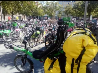 Raptobike de las mejores lowracer, rapidísima en el llano. Práctica para velocidad o cicloturismo. Incluye: - Rueda delantera 20" y trasera 26"ambas con neumático Swalbe Durano. - Frenos V-brake. Se incluye el freno trasero de la foto para montar rueda de 700. - Pedales automáticos shimano. - platos 36, 60 y 70 dientes (desmontado). - Bielas de 155mm mejor medida para las reclinadas, más respetuosas con la rodilla. - Asiento de fibra con acolchado de trama ultratranspirable. - Reposa cabezas minimalista (el cual está montado) y el original más mullido. - Guardabarros delante y atras (reparado)
