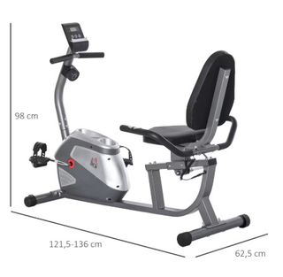 Bicicleta de entrenamiento reclinada con respaldo de HOMCOM. Articulo utilizado 2 veces, se vende por mudanza. No envío, solo recogida cerca de Guadarrama (Madrid) Monitor LCD muestra tiempo, velocidad, las calorías quemadas, la distancia recorrida y la frecuencia cardíaca. Disco de inercia de 3 kilos. Cuenta con una resistencia magnética de 8 niveles ajustables. Especificaciones: -Material: acero, ABS -Medidas: 121,5-136x62,5x98 cm (LxANxAL) -Peso de volante de inercia: 3 kg -Carga máxima: 110 kg -Certificaciones: CE-EMC, Rohs