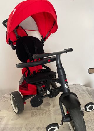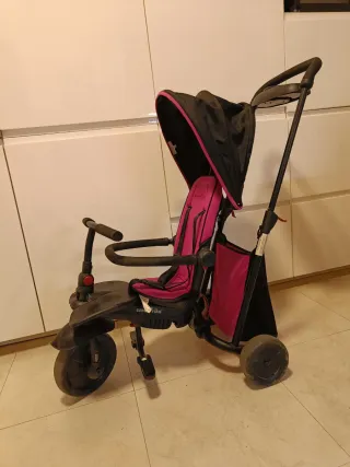 Triciclo Smartrike plegable, evolutivo muy comodo, practico y completo. - Reposapies bebe, niño y pedales - Arnes y barra de seguridad - Asiento un poco reclinable - Soporte para biberon o vaso - Capota protectora. - Manillar adulto regulable en altura