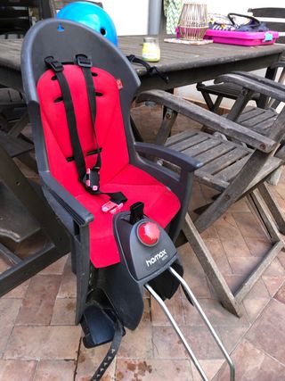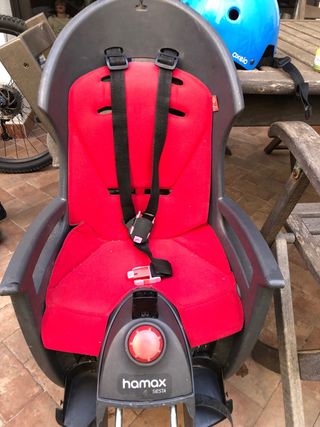 Silla para transportar niños en bicicleta. Cuenta con un asiento acolchado y cinturones de seguridad. - Asiento acolchado en color rojo. - Cinturones de seguridad ajustables. - Estructura de plástico resistente y soportes metálicos. marca Hamax silla reclinable para cuando el niño se duerme. no le falta ninguna pieza viene con el enganche