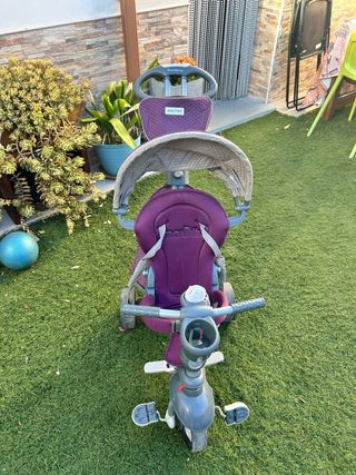 Muy, muy poco usado, está como nuevo, solo con una pequeña marca en el manillar, se ve en la foto. En las ruedas desmontadas, la capota, el manillar del bebé... se ve el poco uso que se ha hecho. Se pliega sin desmontar y ocupa muy poco espacio. Con arnés de 5 puntos y barra delantera de seguridad y asiento acolchado lavable, con posición reclinable para la siesta del bebé. Respaldo alto, ruedas eva, cesta-bolsita trasera y bandeja en el manillar. 7 combinaciones según desarrollo: carrito de paseo con reposa piernas o pies (estimula curiosidad), triciclo, con o sin pedales y dirigido por papás o niños. Capota y manillardesmontable.