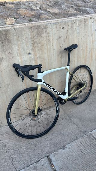 Bicicleta de carretera Ridley con un diseño elegante en blanco y dorado. - Cuadro de carbono. - Frenos de disco. - Ruedas DT Swiss R470.