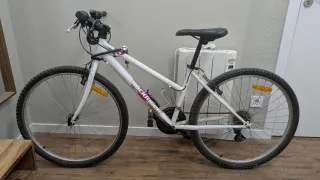 Bicicleta de montaña Rockrider en color blanco. - Cuadro de aluminio. - Ruedas de 26 pulgadas. - Frenos V-brake. - Cambio Shimano. Es una buena bici, es fácil de usar y si no sabes muy bien es ideal, para rutas o paseos va genial.Es muy cómoda.