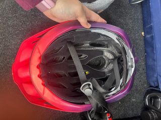 Casco de bicicleta Rockrider con diseño degradado. - Color degradado de morado a rojo. - Visera integrada. - Sistema de ventilación con múltiples orificios. - Correa ajustable.