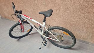 Bicicleta de montaña Rockrider con muy poco uso, solo 1 mes. - Modelo: Rockrider ST 100 - Color: Blanco y negro - Ruedas: 27.5 pulgadas - Frenos: Disco mecánicos - Cuadro: Aluminio Habría que cambiar la cámara de la rueda delantera por lo demás esta como nueva El foco y el extensor de manillar no está incluido ,la mochila y los posa pies si. Tiene también una pastilla de freno nueva, y otra por poner, que esta incluida con la bici, ya que ya suena un poquito