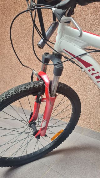 Bicicleta Rockrider de montaña. - Cuadro blanco. - Ruedas de 26 pulgadas. - Frenos V-Brake.