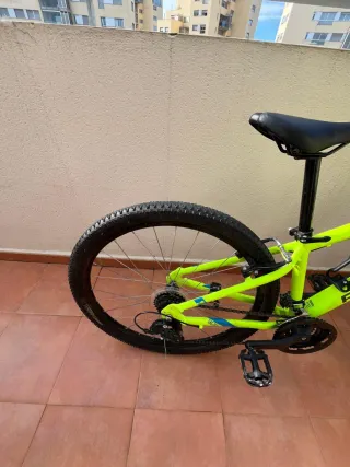Bicicleta de montaña Rockrider ST 520 en color verde lima. - Cuadro de aluminio. - Suspensión delantera. - Frenos de disco Hayes hidraulicos - Ruedas de 27.5 pulgadas -Cuenta kilómetros -En buen estado, poco uso y revisada, se le han montado cambio trasero, cadena nueva, cubierta trasera y pastillas de freno todavía sin estrenar.
