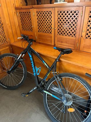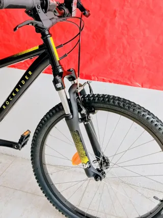 Bicicleta de montaña Rockrider ST120. Ideal para un empiezo en mtb, es nueva, se puede ver por los neumáticos, casi sin gastarse. Es talla XL. - Cuadro de aluminio. - Frenos de disco. - Ruedas de 27.5 pulgadas. - Color negro con detalles azules. - Monoplato de 9 velocidades - Suspensiones ajustables