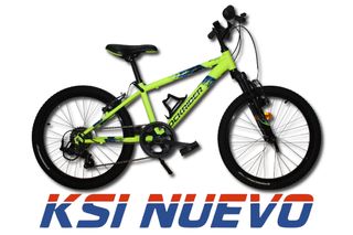 Bicicleta infantil Rockrider en color verde lima, ideal para niños de 6 a 11 años. - Cuadro de aluminio ligero. - Frenos de disco. - Suspensión delantera. - Cambio de marchas. - Ruedas de 20 pulgadas.