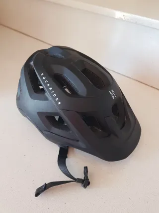 Casco de bicicleta de montaña Rockrider en color negro. Diseñado para ofrecer protección y comodidad. - Marca: Rockrider - Color: Negro - Cierre de correa ajustable