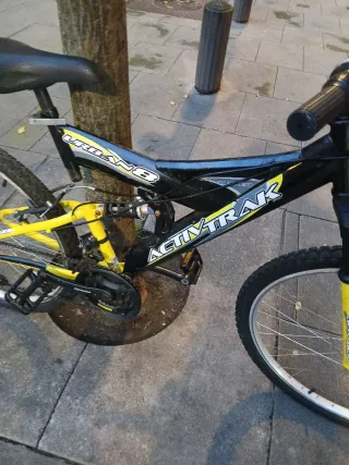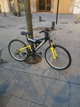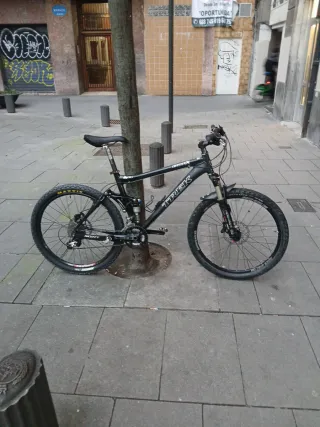 Bicicleta de montaña con doble suspensión, ideal para terrenos irregulares. Combina un cuadro negro con detalles en amarillo. - Ruedas de 26 pulgadas. - Doble suspensión delantera y medio SOMOS UN PROYECTO DE INSERCIÓN LABORAL, donde encontraras un taller, venta de material y bicicletas de segunda mano a tu medida. Pásate a conocernos en la Plaza MORAZA No 5 Bilbao -Bizkaia- o visítanos en bizieskola. net. RECOGEMOS TODO TIPO DE BICICLETAS. ¡¡¡ No es tu bici!!! Escribe Bizieskola en el buscador de Wallapop y encontraras lo que estás buscando. BH, ORBEA, CONOR, SCOTT, KONA N110
