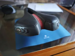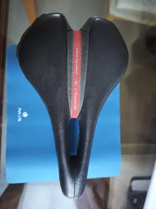 Sillín de bicicleta con diseño prostático y detalles en rojo y gris. La marca Specialized está visible en la parte central. - Diseño ergonómico. - Material: Cuero sintético. - Color: Negro con detalles rojos.