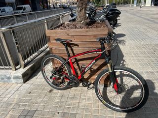 Bicicleta de montaña Specialized en color rojo y negro. - Talla 17.5 pulgadas. Persona de 1,75-1,80 - Cuadro de aluminio m5 de una sola pieza. - Suspensión delantera. - Frenos de disco. -Ruedas de 26”