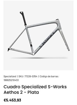 Cuadro de bicicleta Specialized S-Works Aethos 2 en color Plata. Modelo de alto rendimiento. - Material: Carbono. - Color: Plata con detalles en negro. - Talla: 54. No ha llegado a rodar a excepción de ajustes. Vendo todos sus componentes. Preferentemente trato en mano. Todo es nuevo con sus facturas y garantías En conjunto se podría negociar el precio. Por unidad ya es más que razonable.