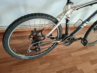 Bicicleta de montaña clásica de la marca Specialized. Un modelo icónico para disfrutar del ciclismo. - Cuadro de aluminio reforzado - Suspensión delantera. - Frenos de disco. - Extensor de manubrio instalado y original incluido. - Asiento de espuma extraíble incluido - Porta móvil y luces incluidos Sistema de cambios de marcha Shimano (funciona pero necesita un ajuste)