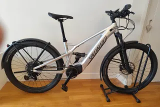 Bicicleta eléctrica Specialized Tero X 4.0 en color plateado. Se vende por no usarla. Apenas tiene 200 kms de uso. Comprada en mayo 2024. Le quedan 14 meses de garantía. - Cuadro de aluminio talla M. - Suspensión delantera y trasera. - Frenos de disco. - Ruedas Specialized Ground Control. - Batería 550ah extraible. - Luz delantera y trasera. - Display Specialezed muy completo con sistema antirrobo. - Soporte trasero para colocar alforjas. - Caballete lateral.