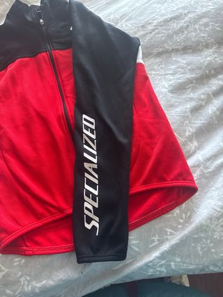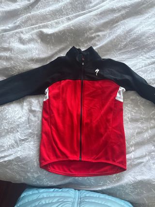 Chaqueta de ciclismo para niños con diseño bicolor. - Mangas y cuello en negro. - Cuerpo principal en rojo. - Paneles laterales blancos.