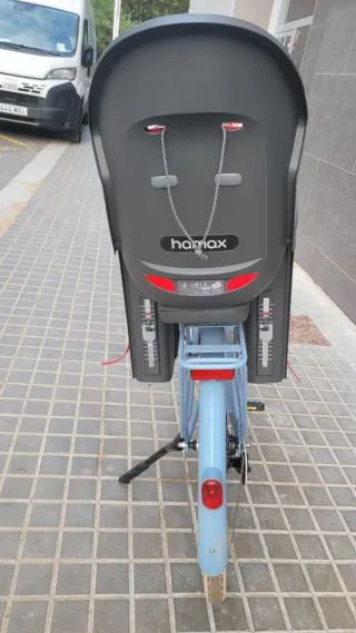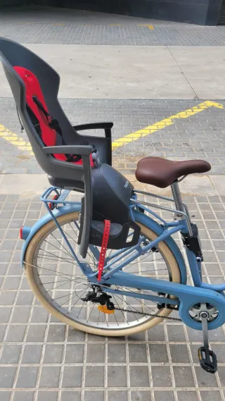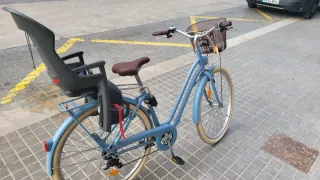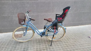 Bicicleta Elops 520 en color azul, ideal para paseos urbanos. Incluye sillita portabebé Hamax. Muy poco uso. Está como nueva. Hasta lleva la etiqueta del precio. - Talla S/M (las tallas son XS - S/M - L/XL) - Sillín marrón. - Cesta delantera de mimbre. - Ruedas con llantas color crema. - Pata de cabra incluida.