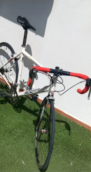 Bicicleta de carretera Scott en color blanco, ideal para entrenamientos y rutas. En buen estado con marcas de uso. Manetas dura ace, frenos 105 y cambio y desviador ultegra 2x10v. Talla 56 - L Sillin giant nuevo. - Cuadro de aluminio. - Horquilla de carbono. - Manillar de carretera. Entrega en mano en elche y murcia.