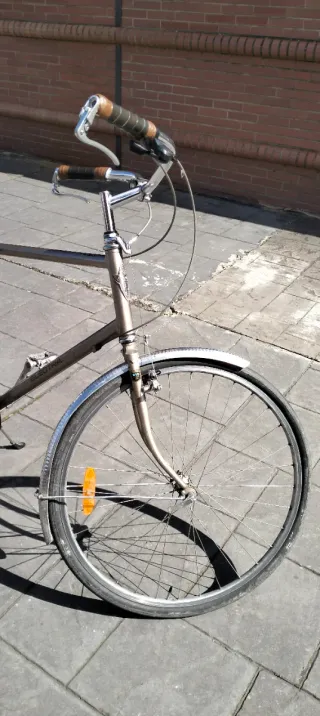 Bicicleta urbana Elops de 28 pulgadas. - Cuadro en color verde oscuro. - Sillín y puños de cuero marrón. - Portabultos trasero. - Guardabarros delantero y trasero. El sillín lo mordió un perro, esta bien cuidada , guardada siempre en trastero, tambien incluye el guardabarros trasero y la parrilla delantera original, estan desmontados, funciona perfectamente la vendo porque me voy a mudar.