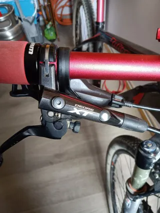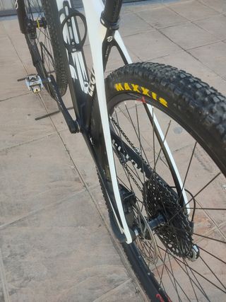 Bicicleta de montaña de carbono en perfecto estado. Lista para usar. Como nueva las cubiertas son las de casa todavia, talla L - Cuadro de carbono. - Ruedas Maxxis. - Frenos de disco. -grupo montado en slk y desviados en xt -Amortiguador rock shock sido
