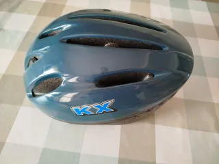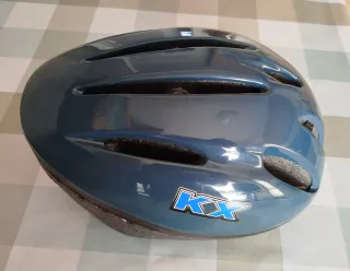 Casco para bicicleta en talla M, color azul con detalles de la marca KX. - Diseño aerodinámico con ventilación. - Interior acolchado para mayor comodidad. - Logotipo de KX en la parte frontal.