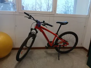 Bicicleta de montaña Rockrider en color rojo. Ideal para iniciarse en el ciclismo. - Cuadro de aluminio. - Suspensión delantera. - Frenos de disco. - Ruedas de 27.5 pulgadas.