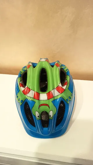 Casco de bicicleta para niños con un divertido diseño. - Color azul brillante. - Dibujo de un personaje verde con detalles rojos y blancos. - Diseño ventilado con rejillas negras.