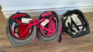 Conjunto de tres cascos infantiles, ideales para bicicleta, patines o patinete. Cada casco tiene un diseño y color diferente. - Casco rojo con etiqueta 53-56 cm, talla S. - Casco rosa fucsia con etiqueta 53-56 cm, talla S. - Casco rosa con estampado de flores blancas, talla S. - Precio por unidad.