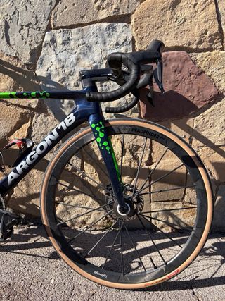 Bicicleta de carretera Argon18 Sum Pro en talla S. Montada con grupo Shimano Dura-Ace y potenciómetro. - Cuadro de carbono. - Ruedas de perfil. - Color verde y azul.