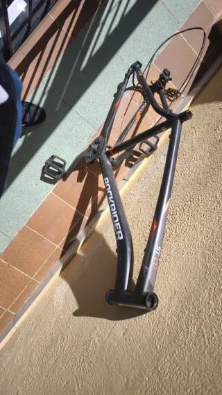 Marco de bicicleta Rockrider en color negro y detalles naranjas. Diseñado para ruedas de 27 pulgadas y talla XL. - Modelo ST 120. - Marca Rockrider.