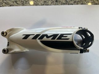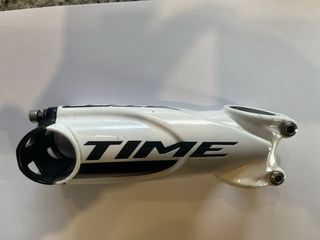 Potencia Time Monolink de aluminio y carbono para bicicleta de carretera - Longitud de 110mm. - Diseño Monolink tiene una pequeña picada en la resina que recubre el carbono pero la fibra no está rota ,el de la tienda de bicicletas sport Florencio me dijo que no tenía importancia y que se puede usar perfectamente solo necesitas respetar los Nm de fuerza al apretar los tornillos que son 5 Nm de Max torque para no romper la fibra que está al descubierto tiene un tornillo oxidado pero eso no es ningún problema