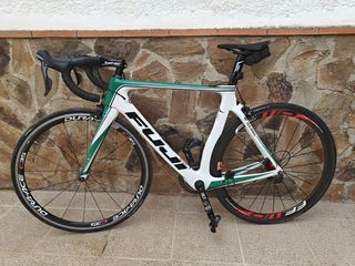 Bicicleta de carretera Fuji Transonic con un diseño aerodinámico y elegante. -Grupo Ultegra 11v mecanico - Platos y Bielas Rotor - Cuadro blanco y verde. - Ruedas Dura-Ace C35. Carbono - Manillar Time. - Sillín negro.